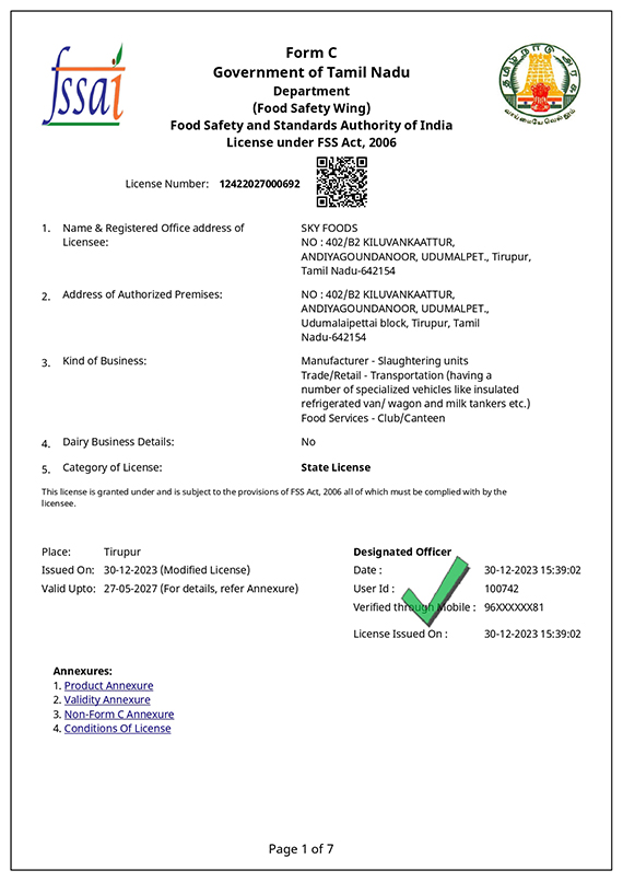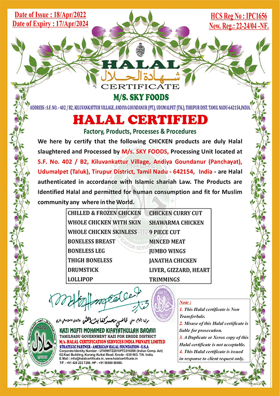 In the last 5 years, SKY FRESH has making it South India's No.1 Food Processing Unit with well-established and Experienced staff producing with Halal basis. SKY FRESH offers various poultry products and services across south India through its operations. The diversified operations of the firm extend to Broiler farms, hatcheries, processing plant and Feed mill, which combine to form a seamlessly integrated business.